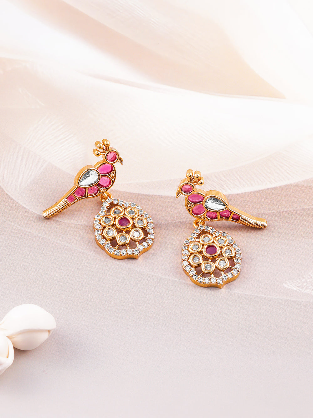 Adorn yourself with the exquisite charm of this Rubans 22K gold-plated necklace set, featuring a stunning peacock design that symbolizes grace and beauty. The set is intricately studded with vibrant Ruby and Kundan stones with cubic zicronia studded, adding a touch of regal elegance. The delicate chain is perfectly paired with matching earrings, each designed to mirror the elegant peacock motif. This jewelry set is a perfect blend of traditional craftsmanship and contemporary style, making it an ideal choice for festive celebrations and special occasions. Let this set enhance your look with its timeless beauty and intricate detailing.