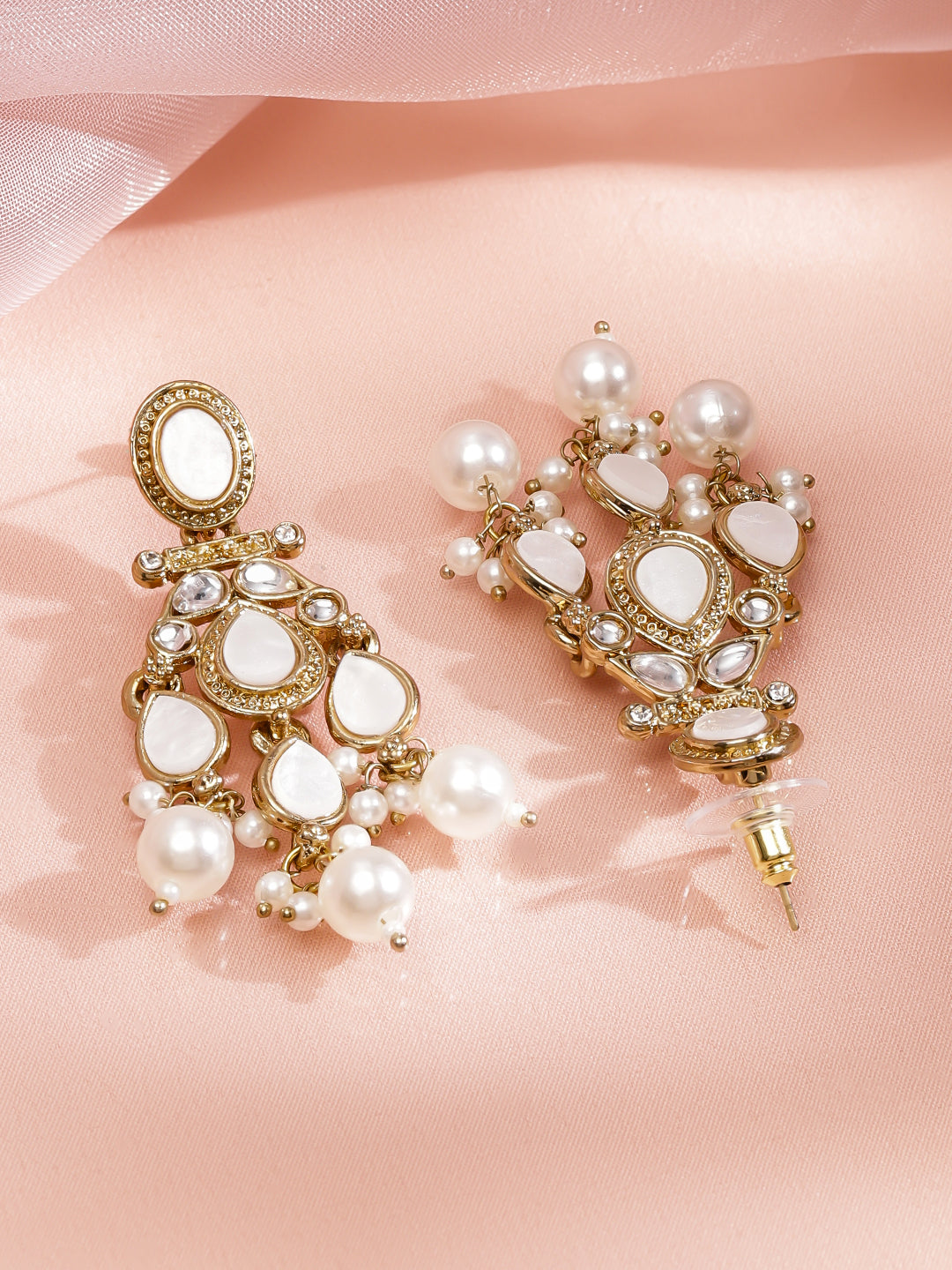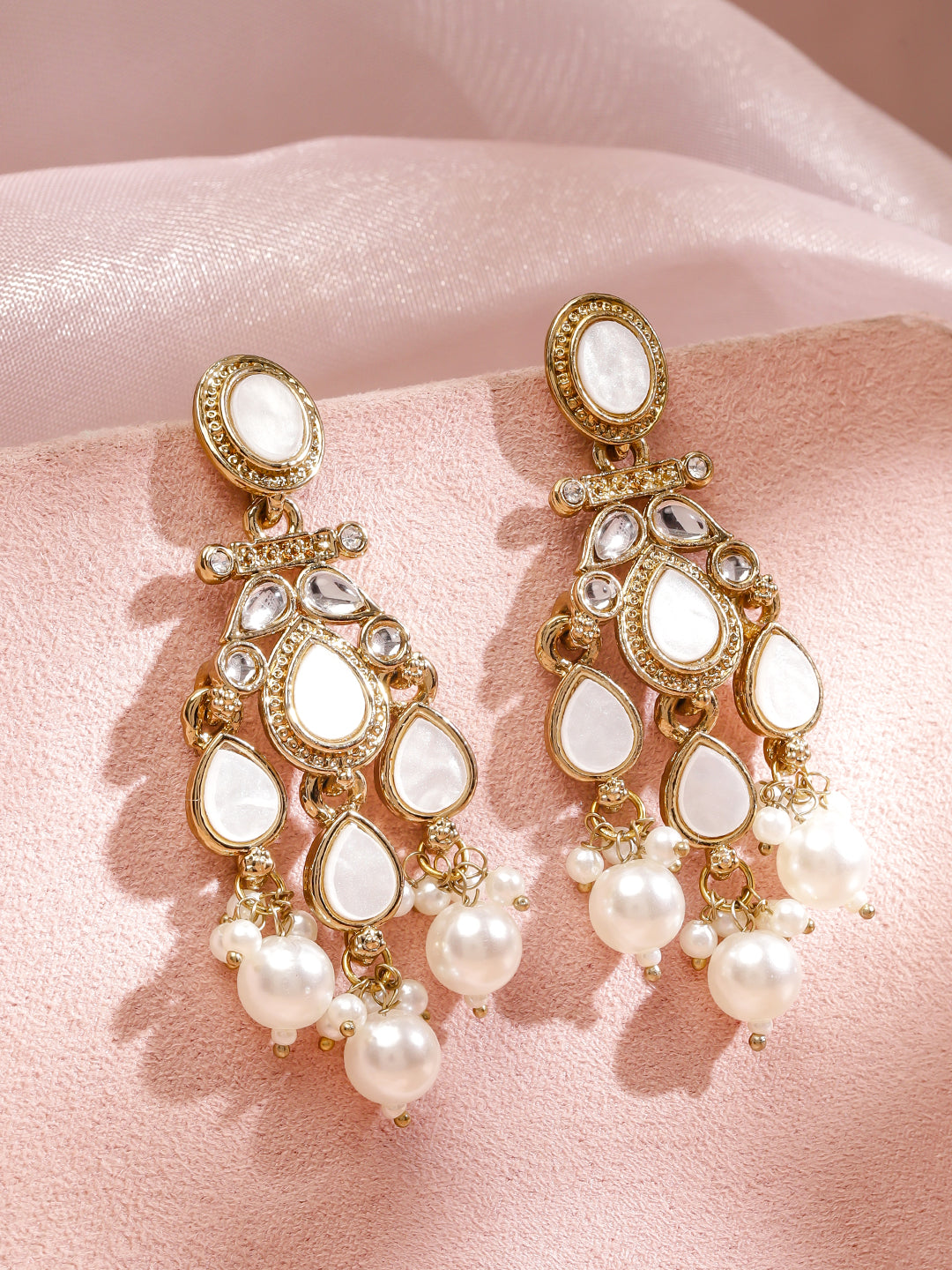 Earrings : These 22K gold-plated chandelier earrings feature kundan, zirconia and glossy pearls with white beads, radiating luxury and grace. Perfect for weddings, parties, festive and traditional occasions.
