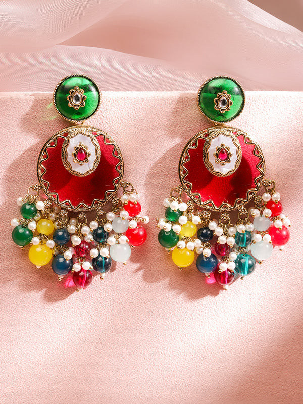Earrings : Rubans 22K gold-plated brass chandbali earrings, handcrafted with pearls and vibrant multicolor beads, offering a bold festive charm perfect for weddings, parties, and traditional occasions.