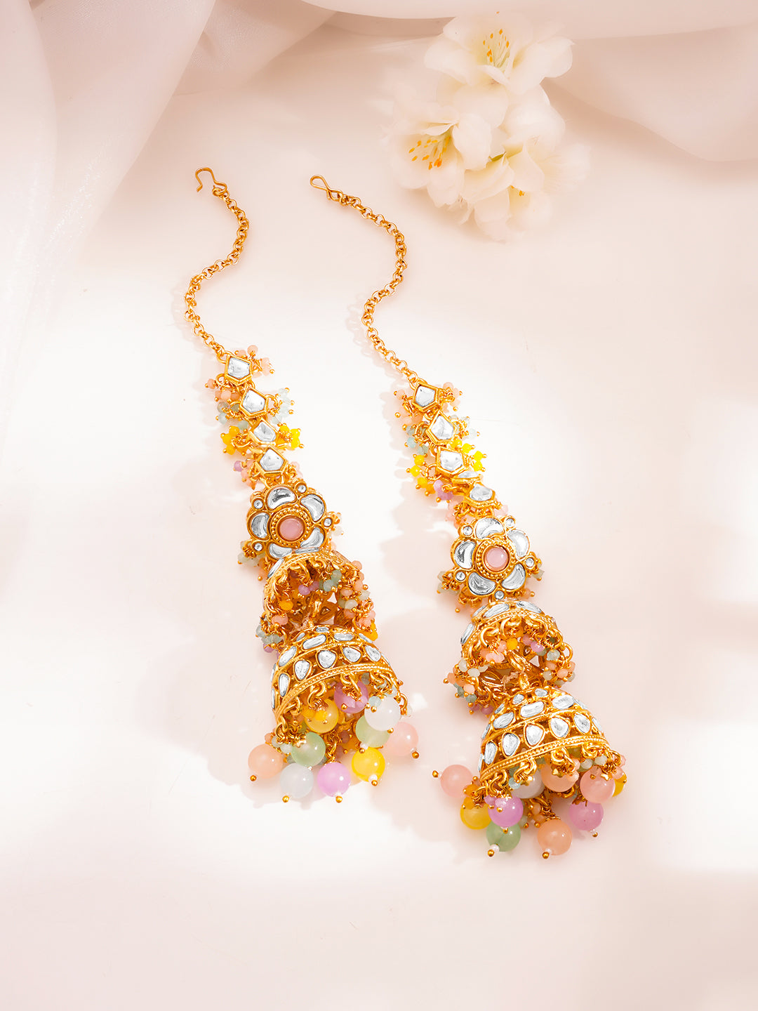 - Pastel Bead Drops: The dome jhumka is enhanced with soft pastel bead clusters that add movement and elevate its statement silhouette.