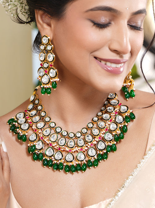 Rubans 18K Gold Plated Brass Kundan Studded Green Beaded Bridal Jewellery Set