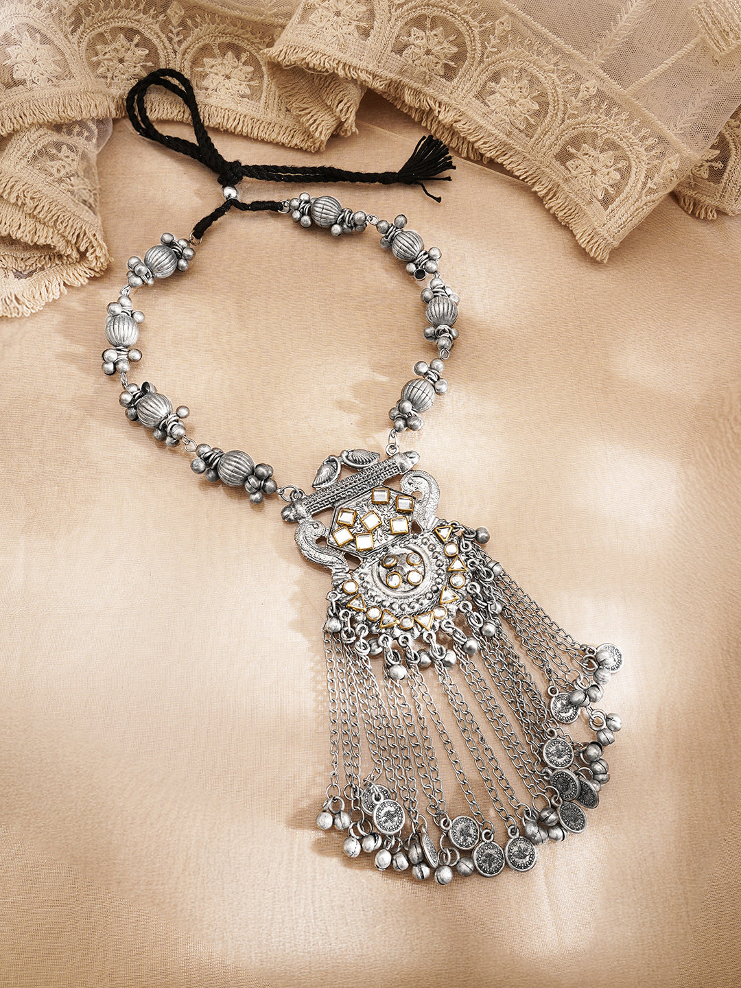 Share on WhatsappOxidised Regal Tassel Statement Necklace