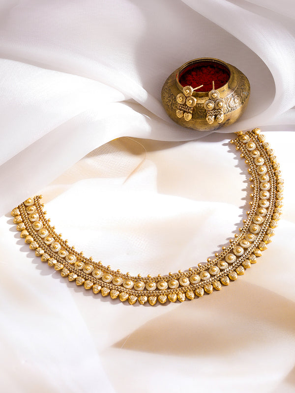 Necklace Set : Elegant Rubans 18K gold-plated brass necklace set with floral coin motifs and golden bead detailing. Paired with matching earrings, perfect for weddings, festive occasions, and cultural celebrations.