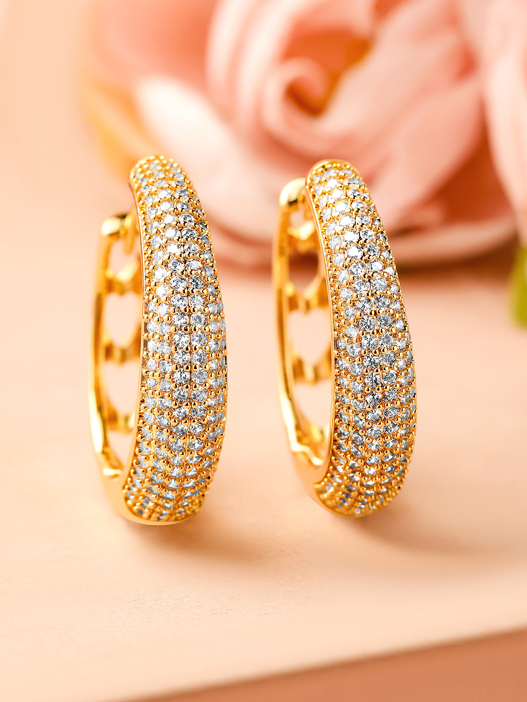 Earrings : Showcasing timeless elegance, these 18K gold-plated hoop earrings are intricately studded with dazzling cubic zirconia. A perfect blend of sophistication and versatility for any occasion.
