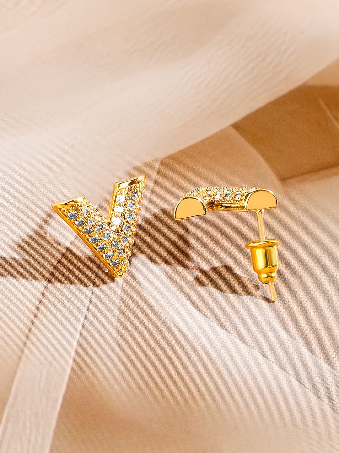 Jewellery Set : This 18K gold-plated set features a sleek V-shaped pendant necklace with matching earrings, elegantly studded with cubic zirconia for a refined sparkle.