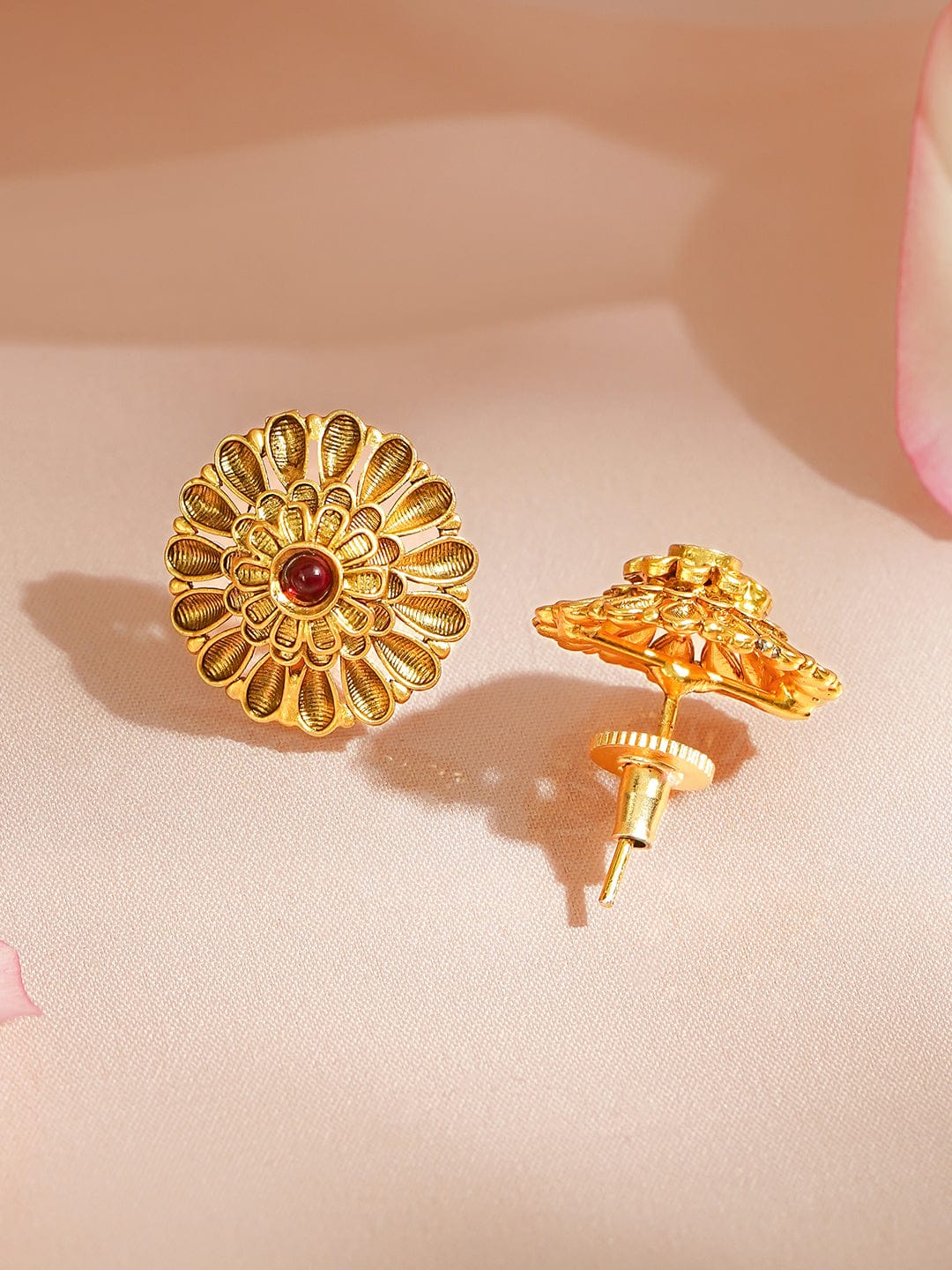 Rubans 18K Gold-Plated Floral Motif Ethnic Pendant Necklace Set with Ruby Red Center Stone Jewellery Set