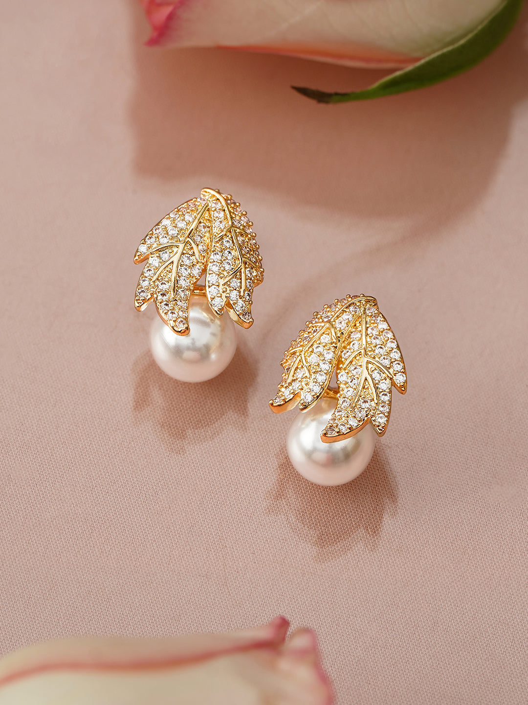 Earrings : These 18K Gold-plated earrings feature a sculpted leaf design encrusted with white cubic zirconia, paired with luminous white pearl drops for a refined elegant look. Ideal for graceful occasions.