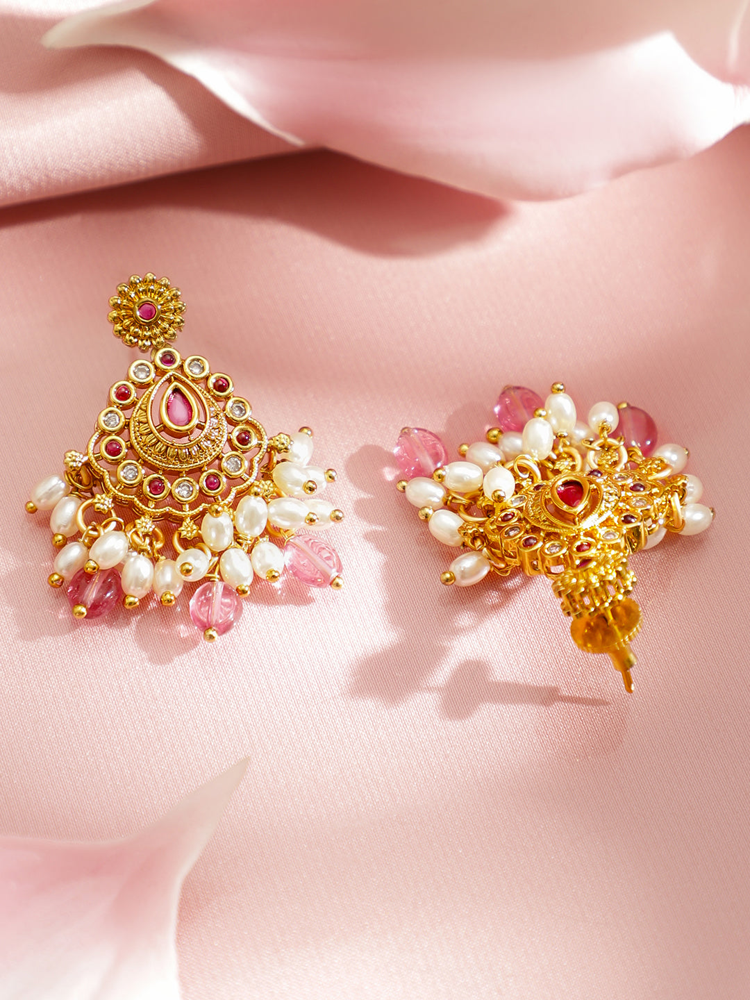 Jewellery Set : A handcrafted 22K gold-plated traditional necklace set, studded with ruby red stones, Cubic Zirconia, glossy pearls & pastel pink drops, perfect for weddings, festive and grand celebrations.
