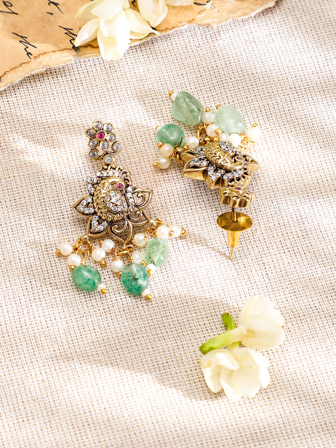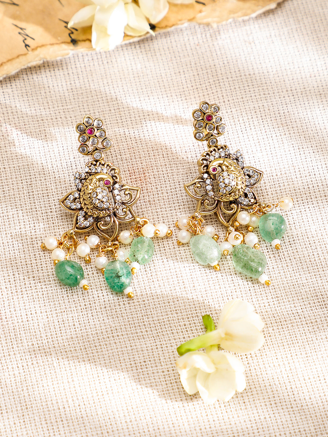 This exquisite 22K gold-plated temple jewellery set features a divine peacock motif adorned with green beads, pearls, and Cubic Zirconia. Complete with matching earrings, perfect for a traditional statement look.