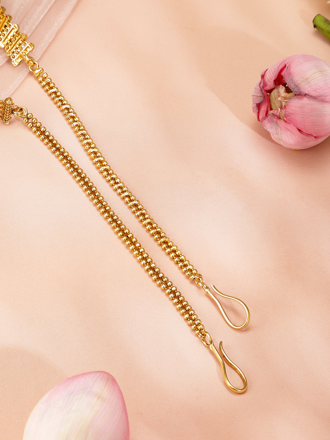 Saree Accessories : This 22K gold-plated handcrafted kamarbandh features an intricate Goddess Lakshmi temple motif, adorned with ruby red stones and gold bead detailing, making it a perfect traditional accessory for ethnic ensembles.