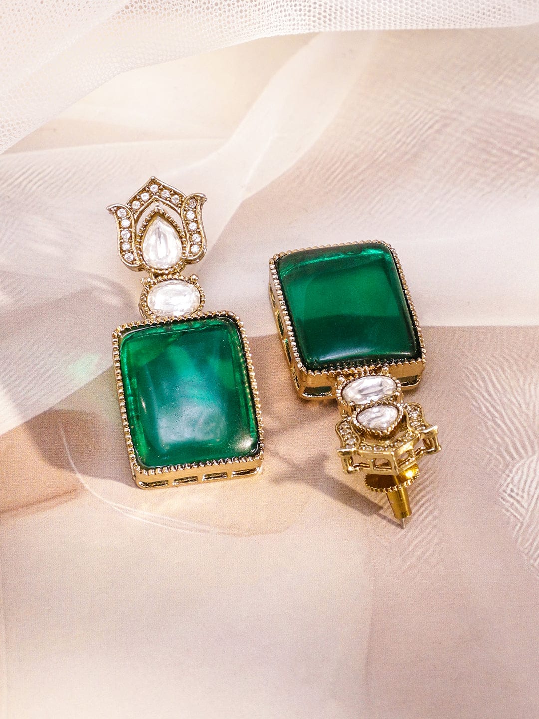 Necklace Set : Handcrafted in brass material with 24K gold plating, this luxury statement set features bold emerald green stones and dazzling Cubic Zirconia in a bold collar necklace and matching earrings for special occasions.