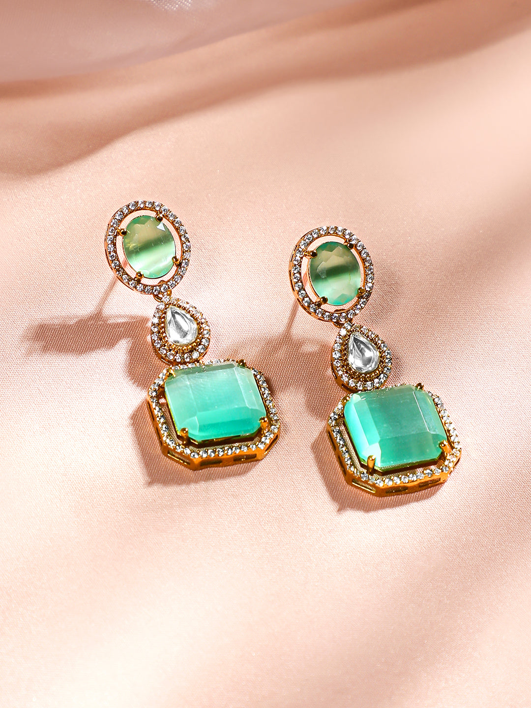 Jewellery Set : This exquisite 24K gold-plated bridal necklace set features pastel green stones elegantly surrounded by sparkling AAA cubic zirconia in a luxurious multi-layered design. Perfect for brides and grand celebrations, this set is the epitome of opulence and sophistication.