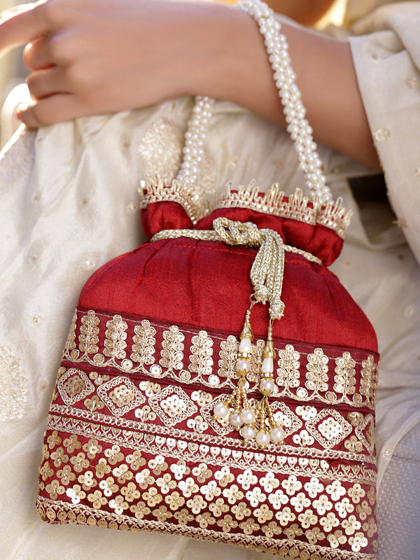 Rubans Red & Gold Embroidered Potli Bag with Pearl Handle & Beaded Tassel Detailing Bags