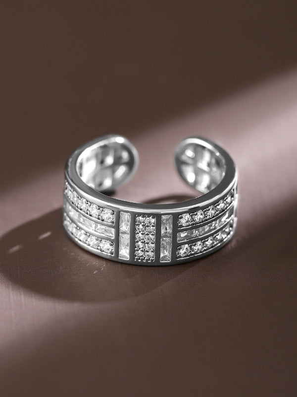 Rubans Rhodium-Plated Adjustable Openable Ring with Baguette & Pavé Cubic Zirconia Finger Ring