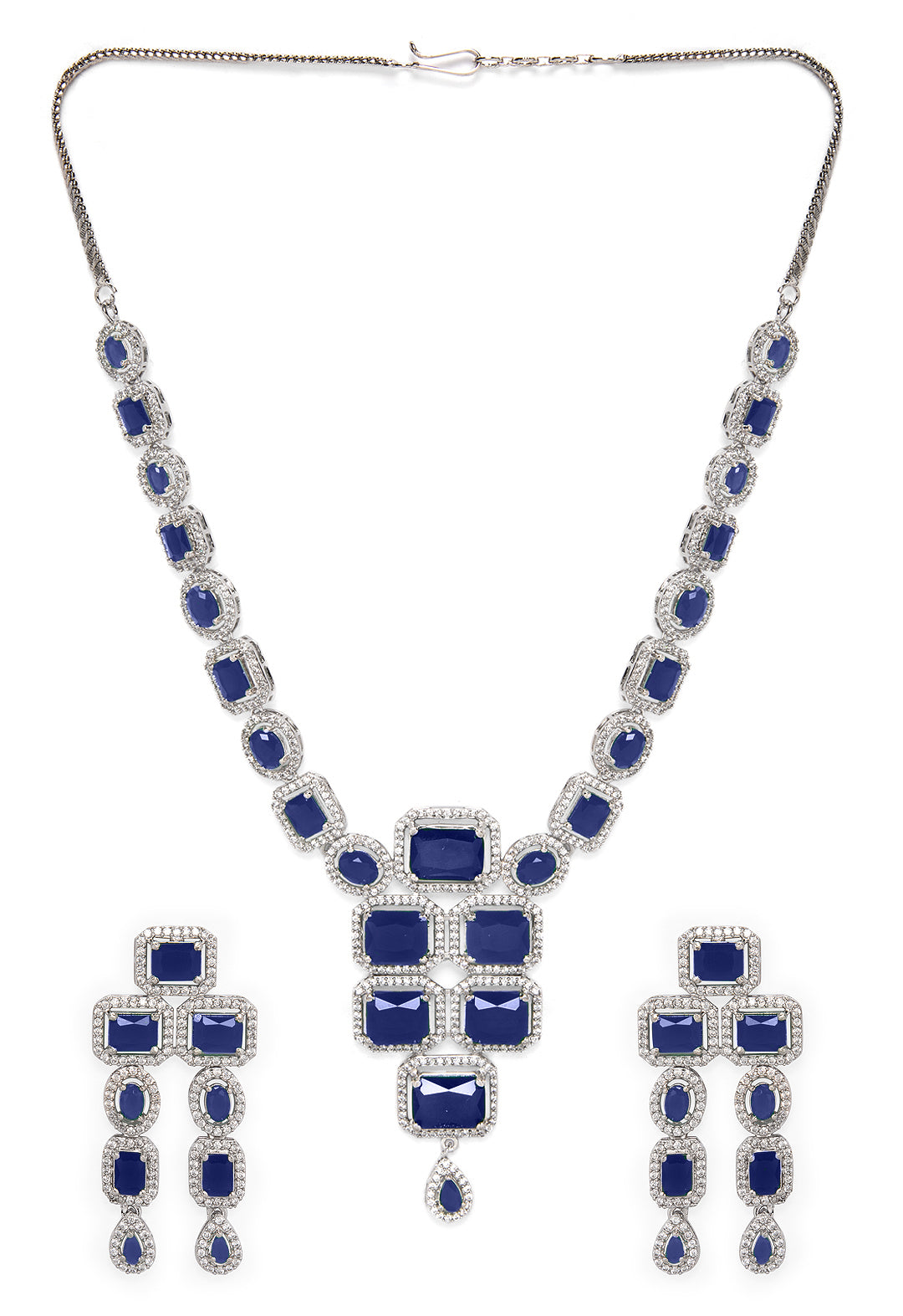 Rubans Rhodium Plated Blue Sapphire & CubicZirconia Studded Premium Statement Necklace Set