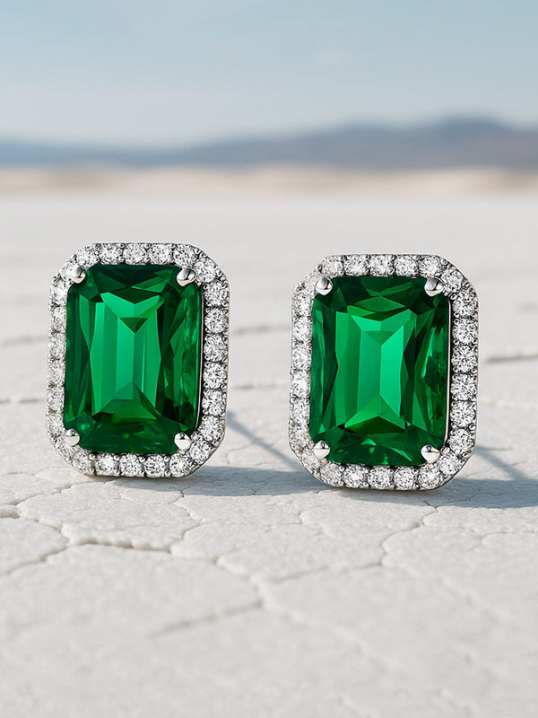 Earrings : Add elegance with these rhodium-plated studs earrings featuring a bold emerald green center stone surrounded by shimmering cubic zirconia accents, perfect for a sophisticated look.
