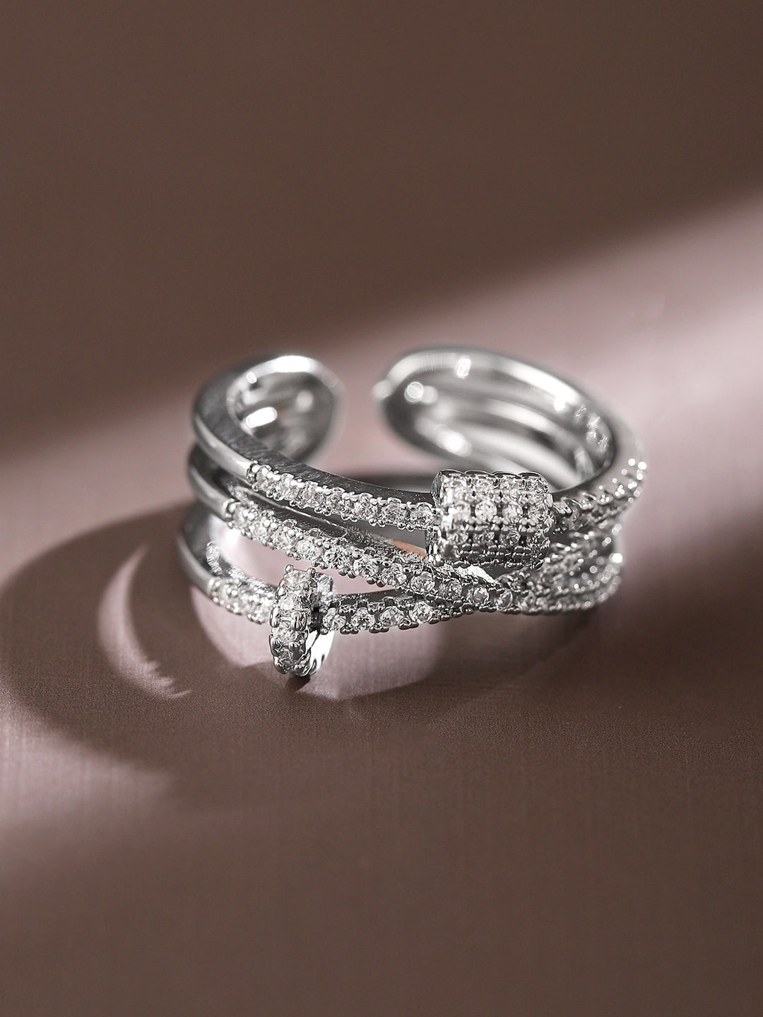 Ring : Elevate your elegance with this rhodium-plated openable adjustable ring, featuring a multi-layered crossover design adorned with pavé cubic zirconia stones, creating a luxurious statement.