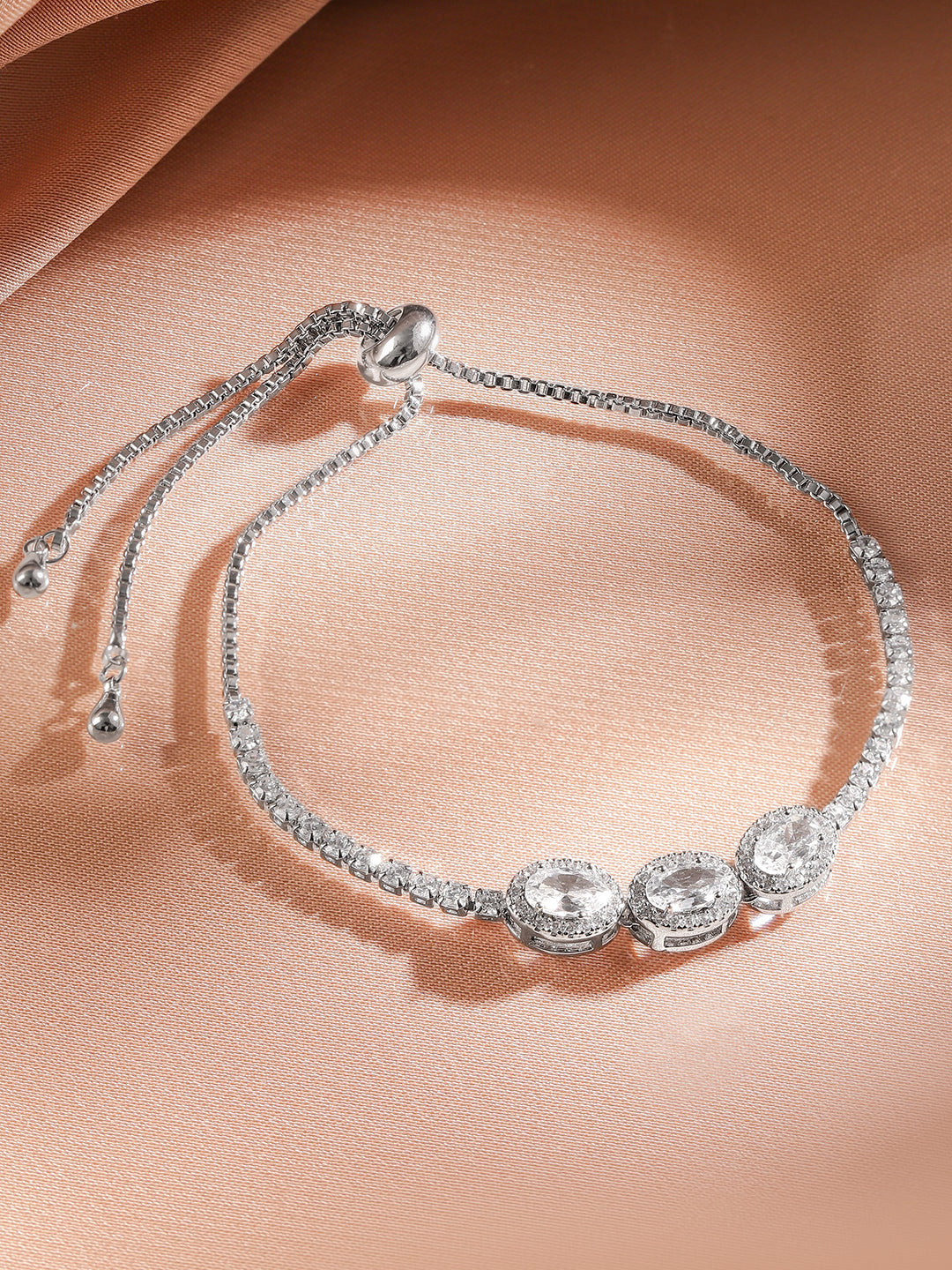Bracelet : This rhodium-plated adjustable pull chain bracelet features sparkling white cubic zirconia stones, including three dazzling oval-cut centerpieces. The sliding chain closure ensures a secure and customizable fit, making it both luxurious and comfortable. (