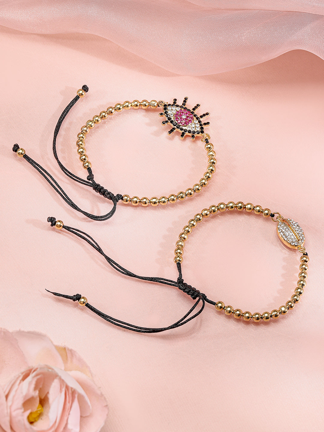 Bracelet : A stunning set of bracelets featuring a protective Evil Eye motif and a sparkling Cowrie shell design. Crafted with 18K gold plating, ruby pink stones, and cubic zirconia for a luxurious look.