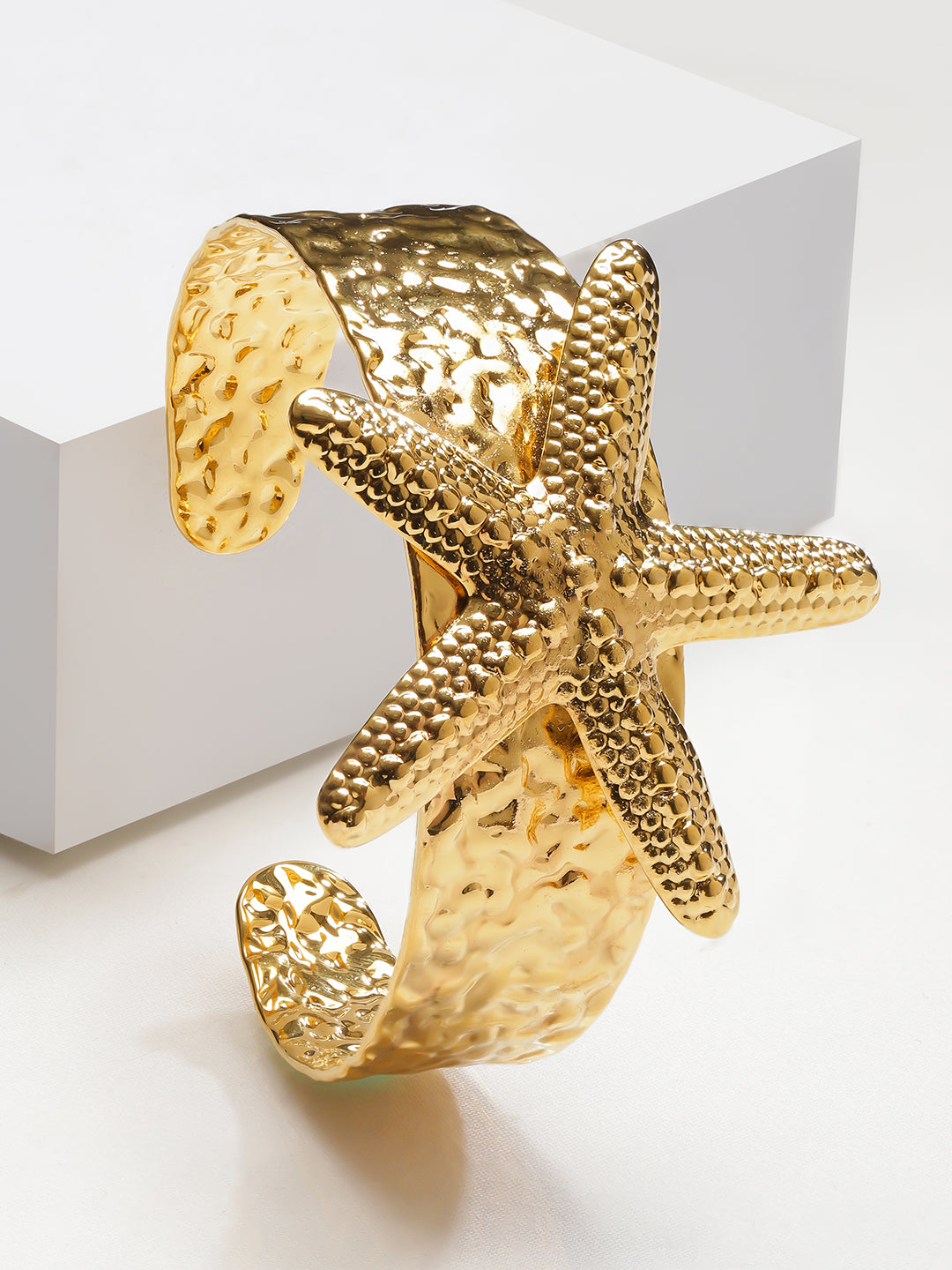 Bracelet : Rubans Voguish18K Gold-Plated Stainless Steel Tarnish-Free Waterproof open cuff bracelet with bold starfish motif and hammered texture, a beach-inspired statement design for daily, party, and holiday wear.