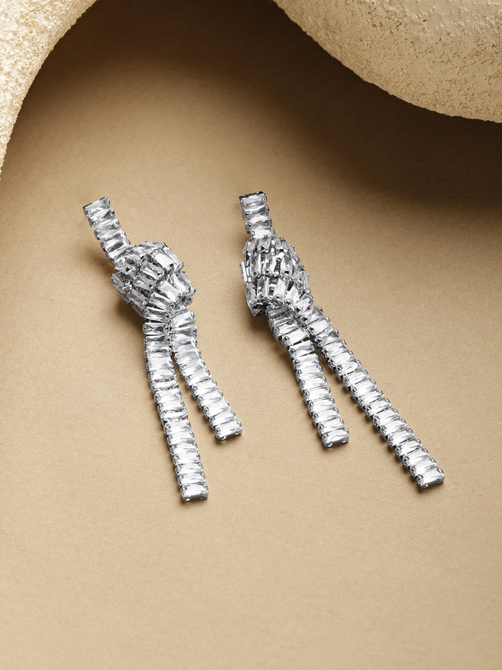 These Rubans Voguish rhodium-plated brass knot dangler earrings, adorned with crystal Cubic Zirconia stones, exude a modern, high-shine elegance perfect for parties and evening wear.