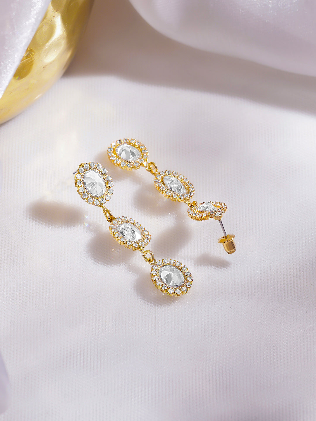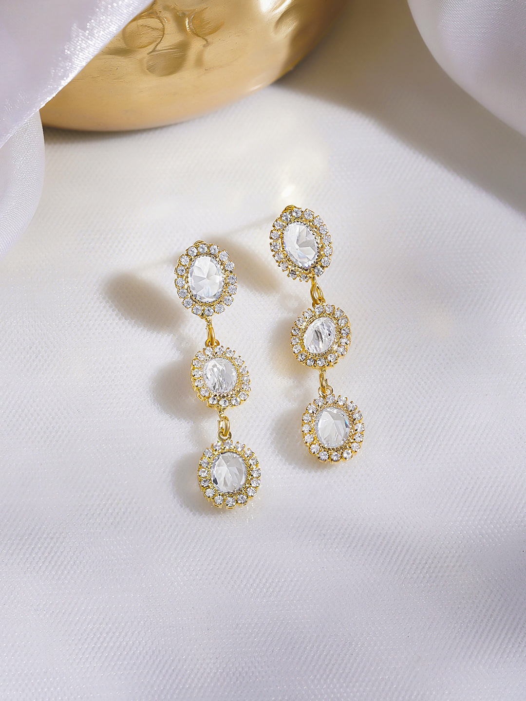 Elegant 18K gold-plated danglers featuring clear Cubic Zirconia in a triple-drop design, offering a refined sparkle perfect for daily wear, parties and chic modern styling.