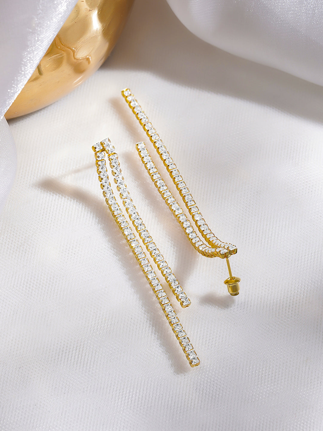 Elegant 18K gold-plated long linear danglers featuring dual-strip cubic zirconia detailing for a sleek, sparkling look perfect for party, festive and evening wear.