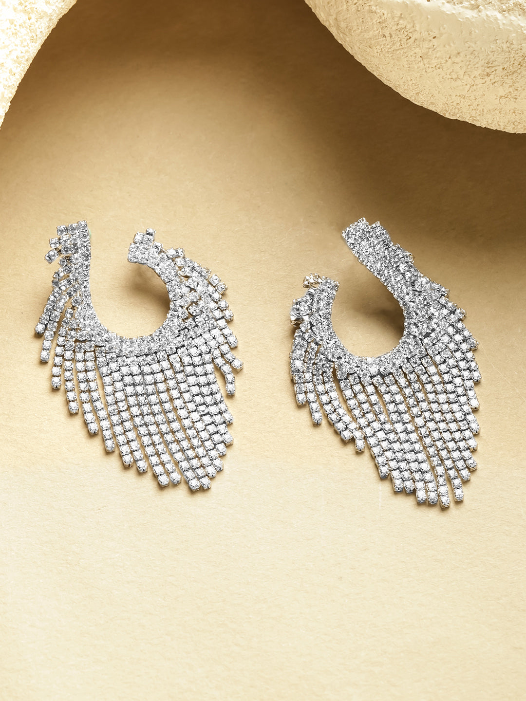 - Fringe Hoop Design: Unique semi-hoop silhouette with flowing crystal tassels.