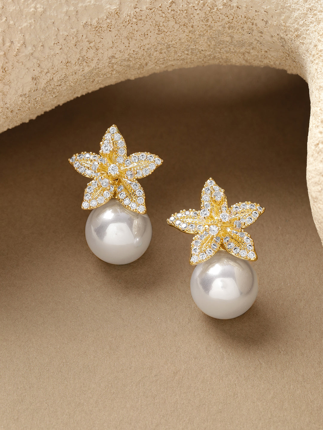 Rubans 18K Gold-Plated Cubic Zirconia Floral with White Pearls Studs