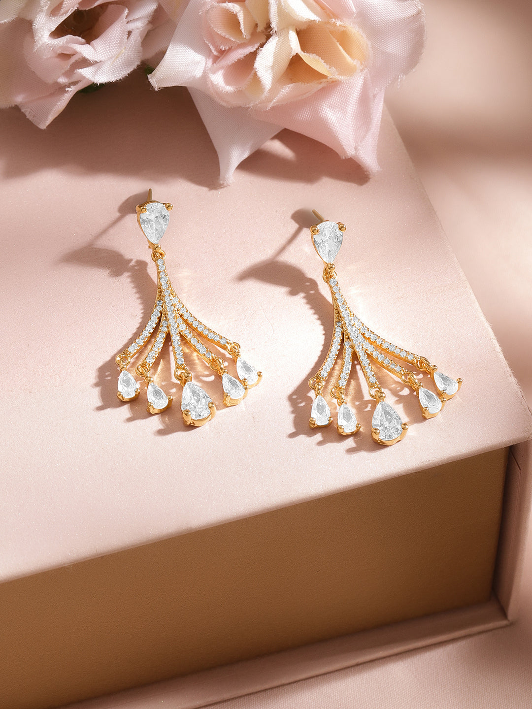 Crafted in 18K gold plated brass these cascade drop earrings feature white Cubic Zirconia in a fan silhouette with pear drops creating a refined statement look perfect for wedding festive evening styling and elegant gifting.
