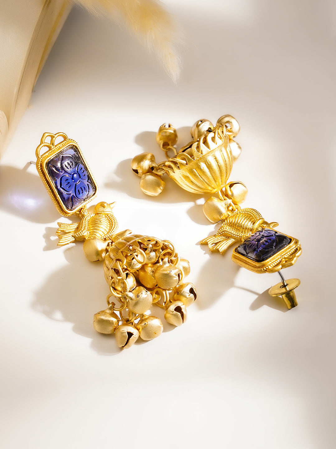 Crafted in 18K gold plated brass with blue carved motif detailing bird accents and ghungroo jhumka drops these earrings offer rich traditional charm graceful movement and festive elegance for weddings