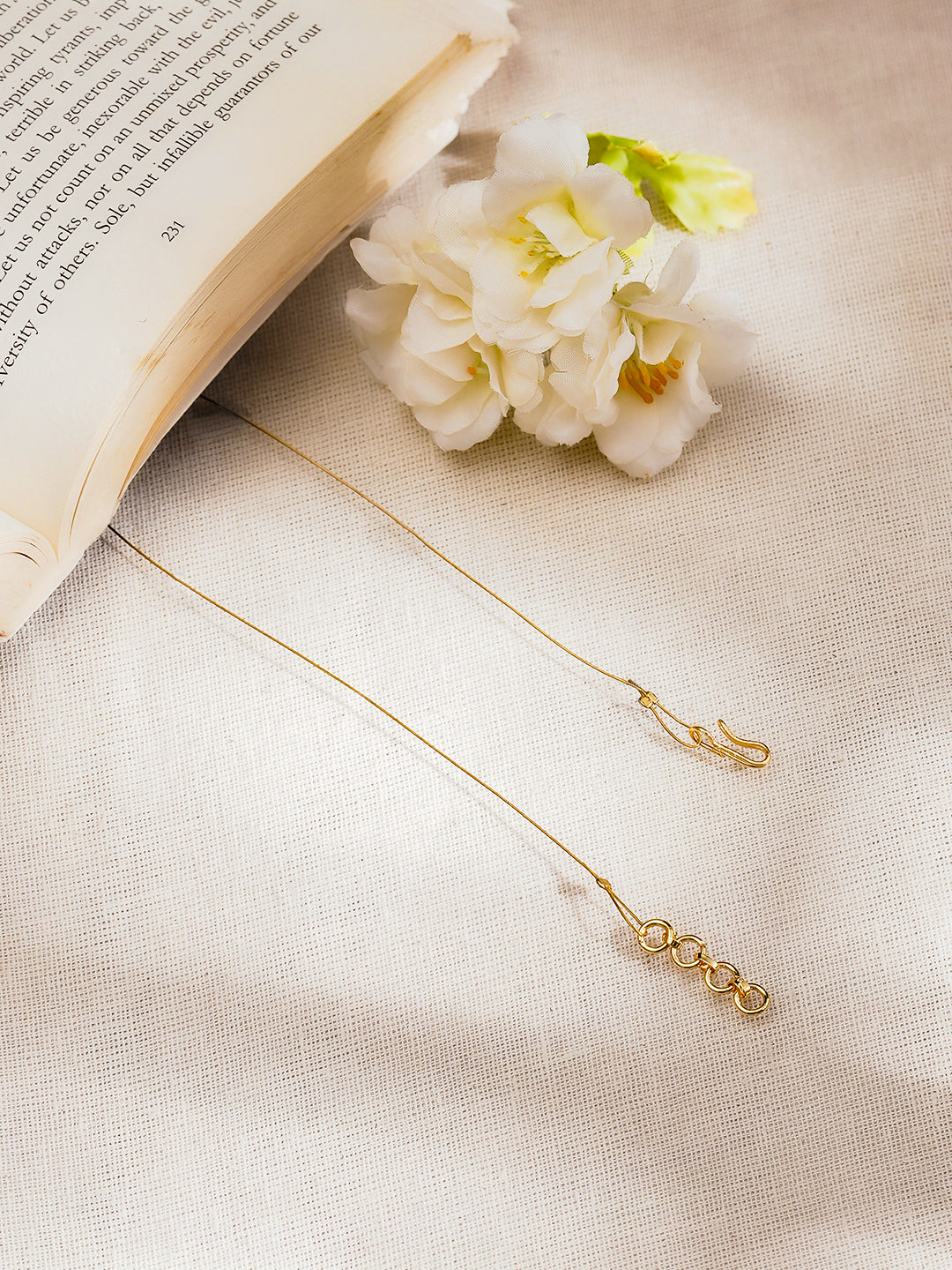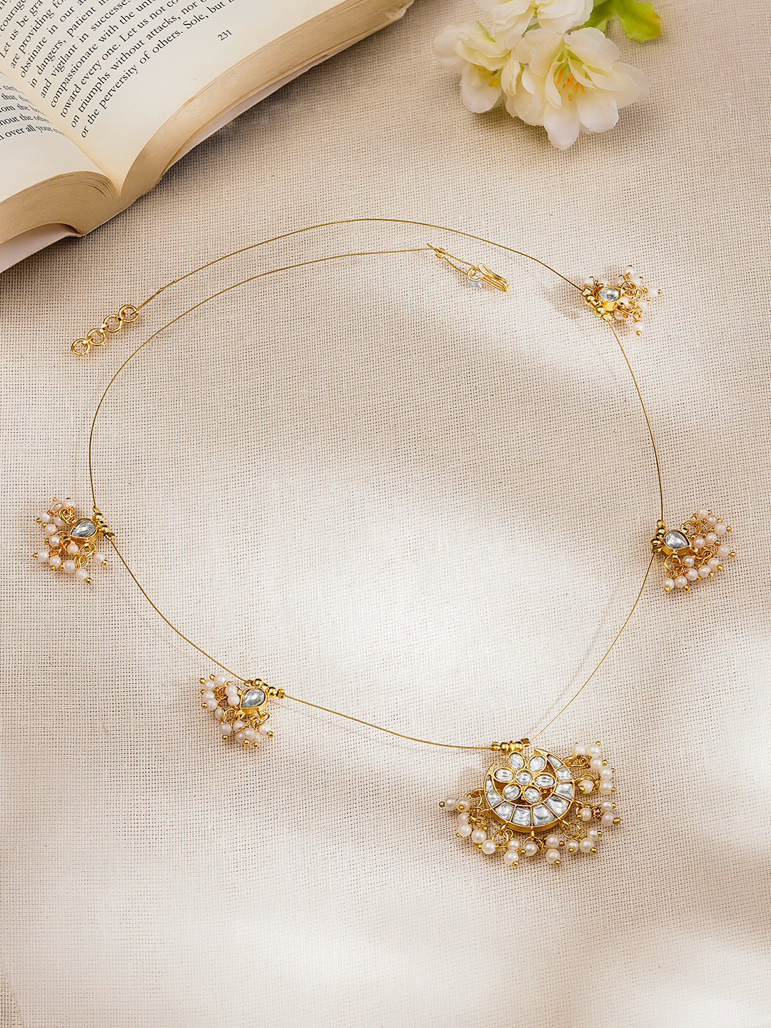 Crafted in 22K gold-plated brass this Rubans necklace set features white kundan detailing and delicate white pearl clusters offering refined elegance for festive wedding and traditional occasions.