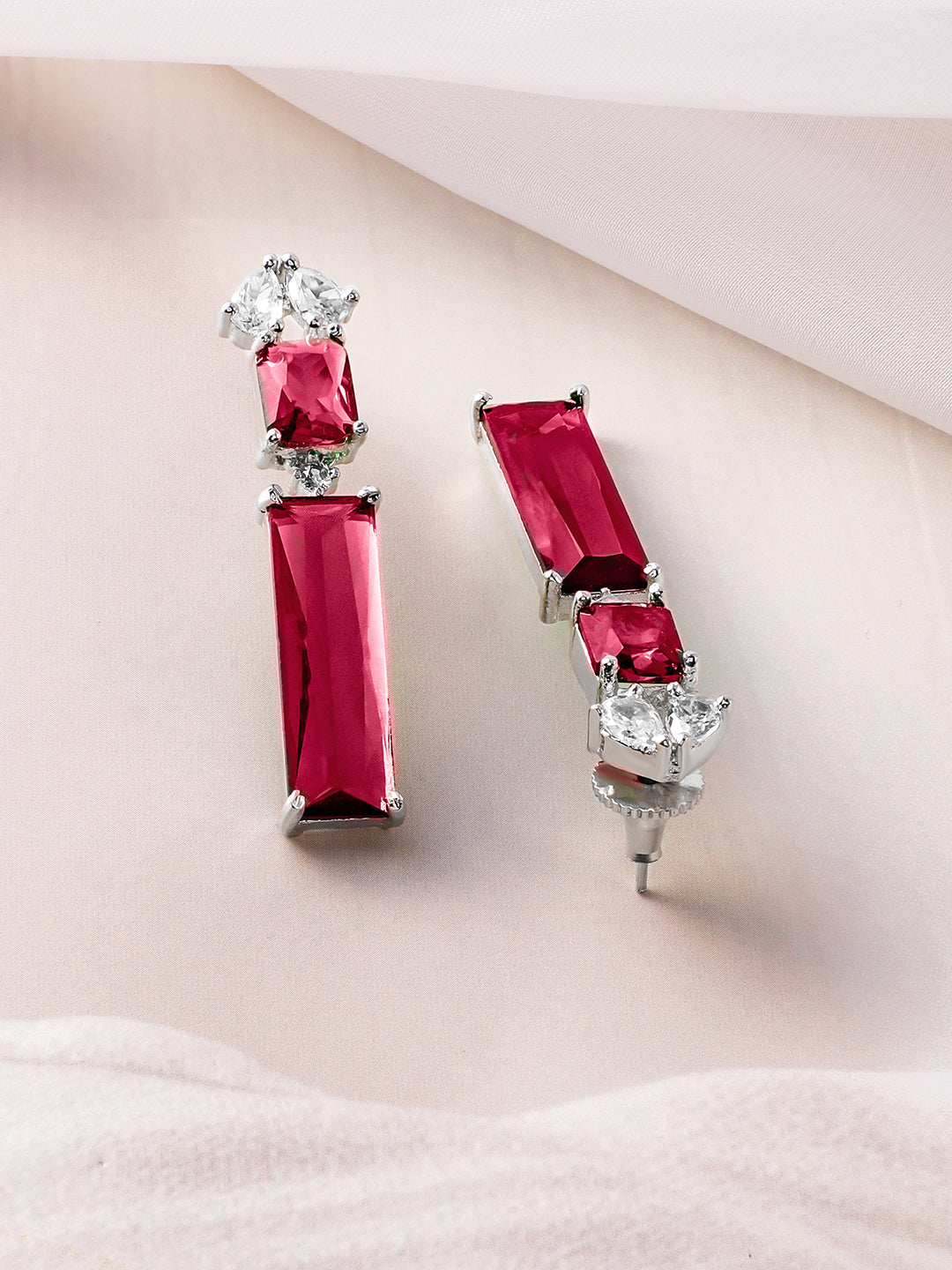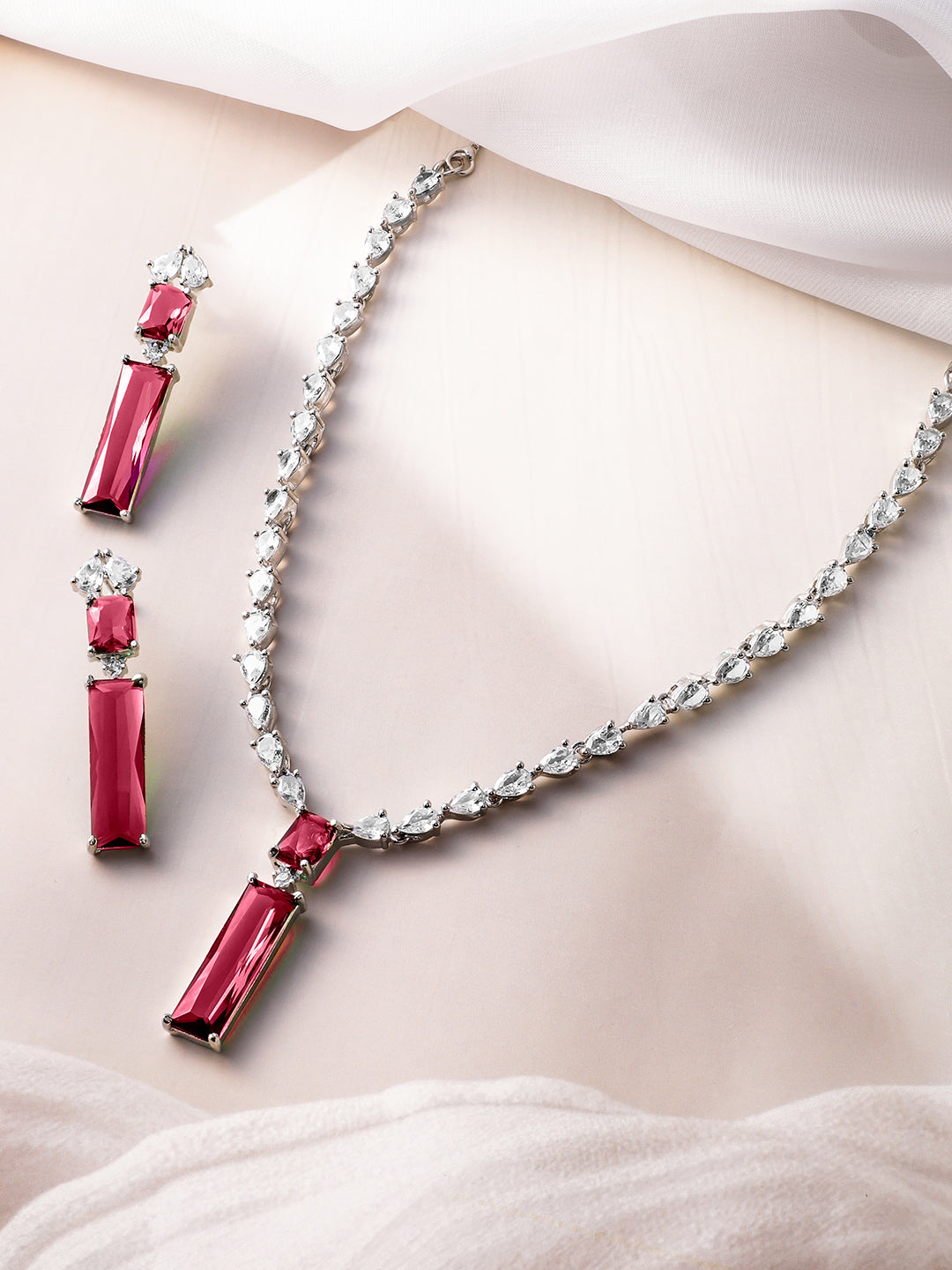 Jewellery Set : Make a bold statement with this luxurious rhodium-plated necklace set, featuring striking emerald green rectangular stones and sparkling white cubic zirconia accents. The necklace is elegantly designed to drape gracefully around your neck, while the matching earrings complete the look with their eye-catching design. Perfect for adding a touch of glamour to your evening wear, this set is a must-have for special occasions.