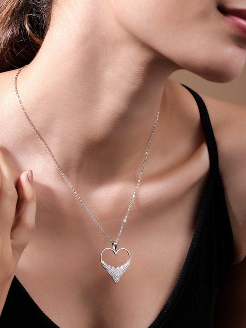 About:-This exquisite heart-shaped pendant necklace features a modern design with a Rhodium plating over stainless steel, ensuring it remains tarnish-free and waterproof. Adorned with sparkling zirconia stones, this necklace adds a touch of elegance to any outfit. Its demi-fine quality makes it a versatile accessory for any jewelry collection, suitable for both casual and formal occasions.