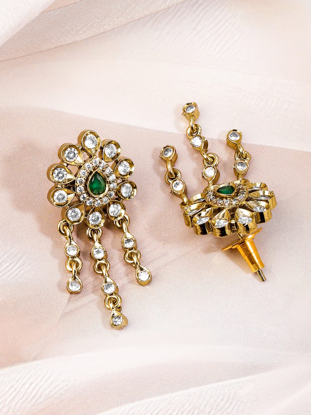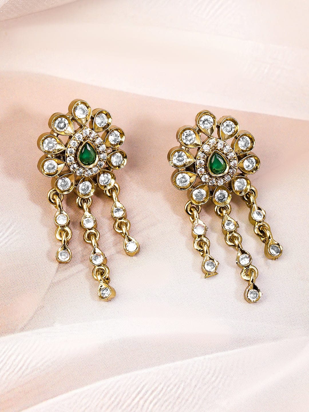 This 22K gold-plated necklace set features emerald green teardrop stones and white cubic zirconia in floral motifs with matching earrings—perfect for festive and elegant occasions for women & girls.