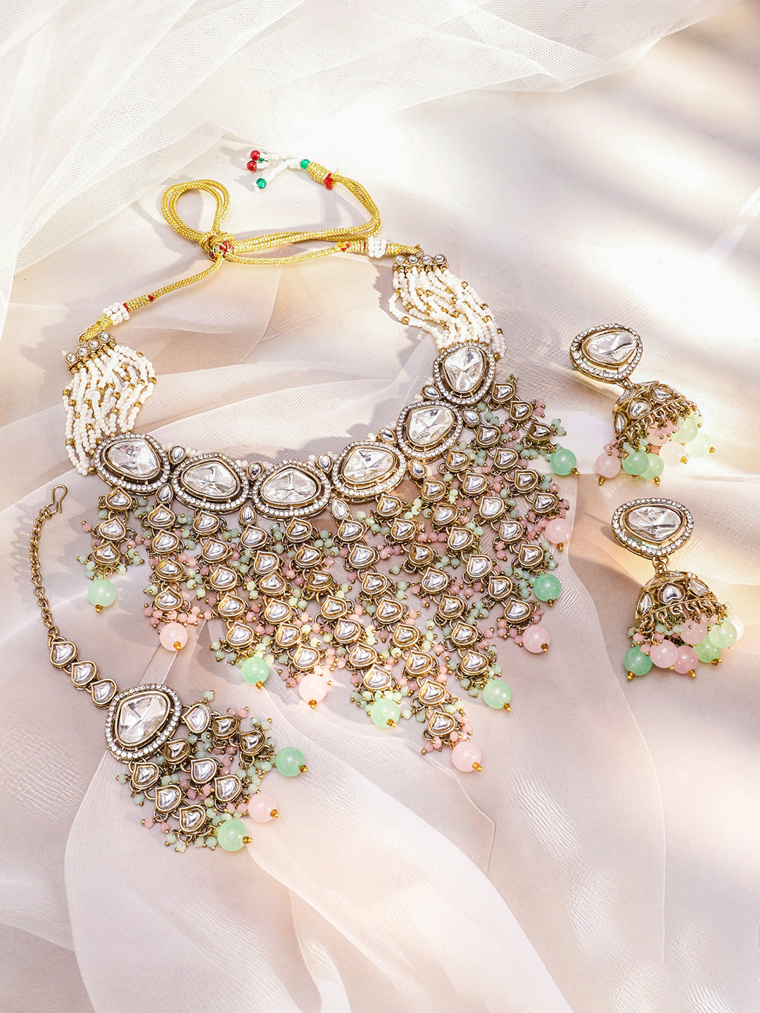 Jewellery Set: This 22K Gold-plated handcrafted necklace set features multi-layer kundan and Cubic Zirconia danglers with pastel green and pink beads, pearl-beaded thread, and matching earrings. Made in premium brass material.