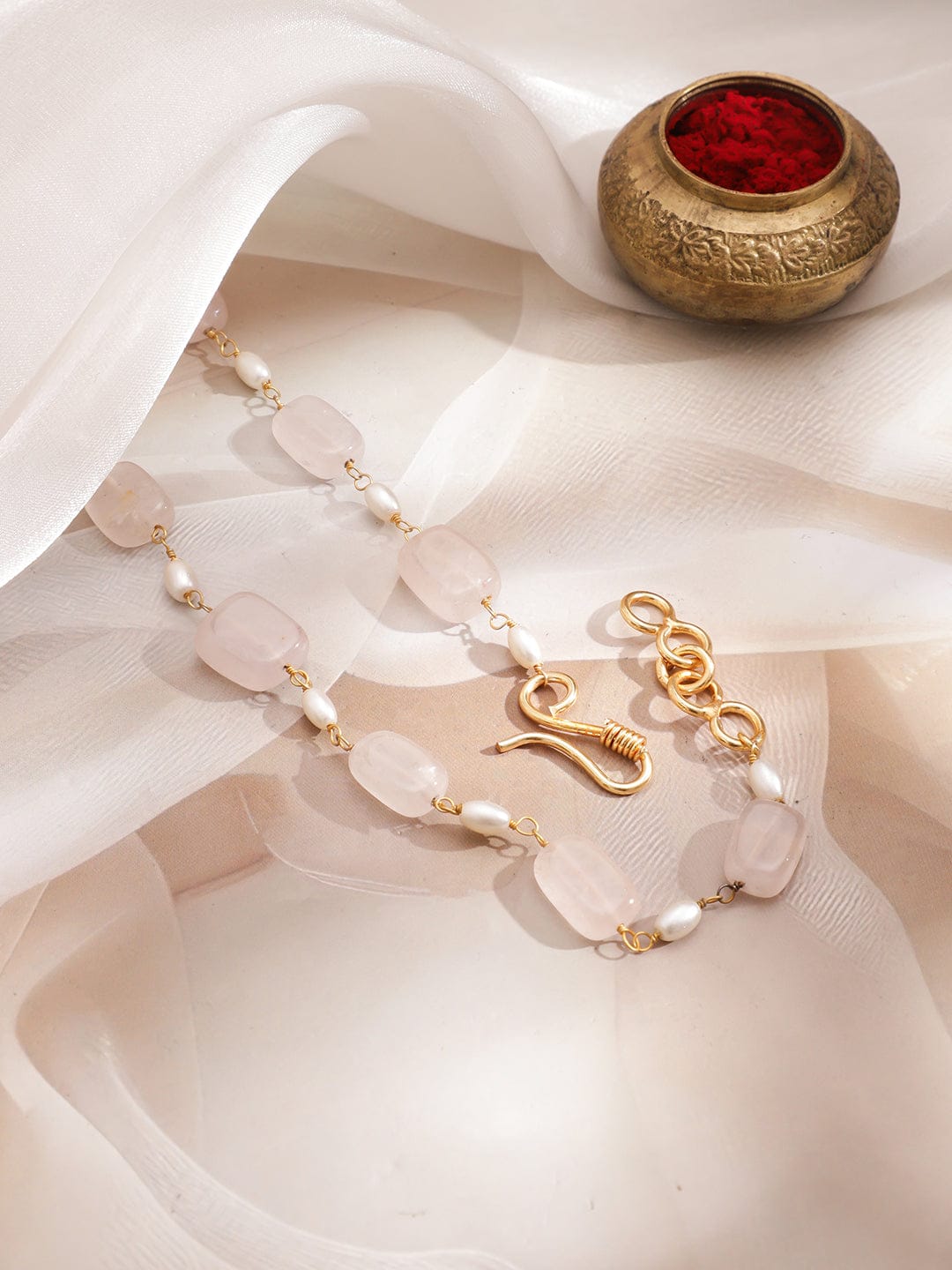 Necklace : Rubans 22K Gold-Plated brass long necklace featuring pastel pink beads, ruby red stones, and pearl accents with antique filigree detailing. Perfect for weddings, festive and party ethnic wear.