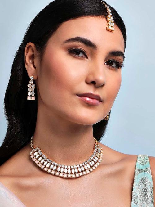 Rubans Gold Plated Necklace Set With Studded Mirror Design And Pink Stones