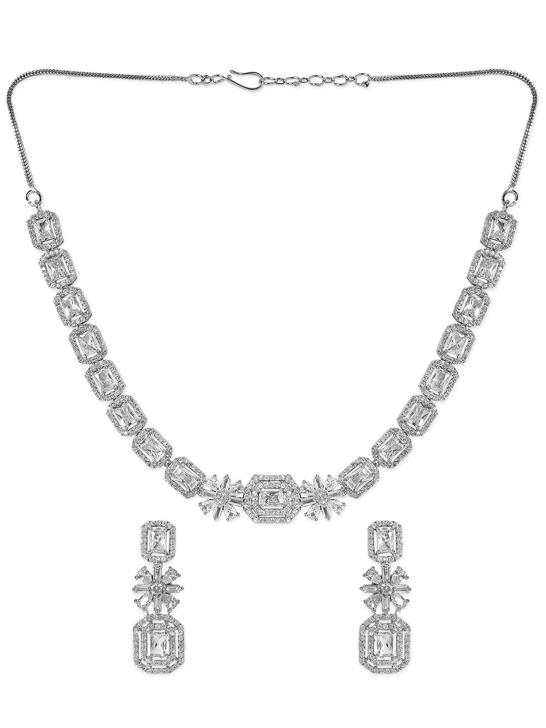 Rubans Rhodium Plated White Cubic Zirconia Stone Studded Floral Classic Jewellery Set