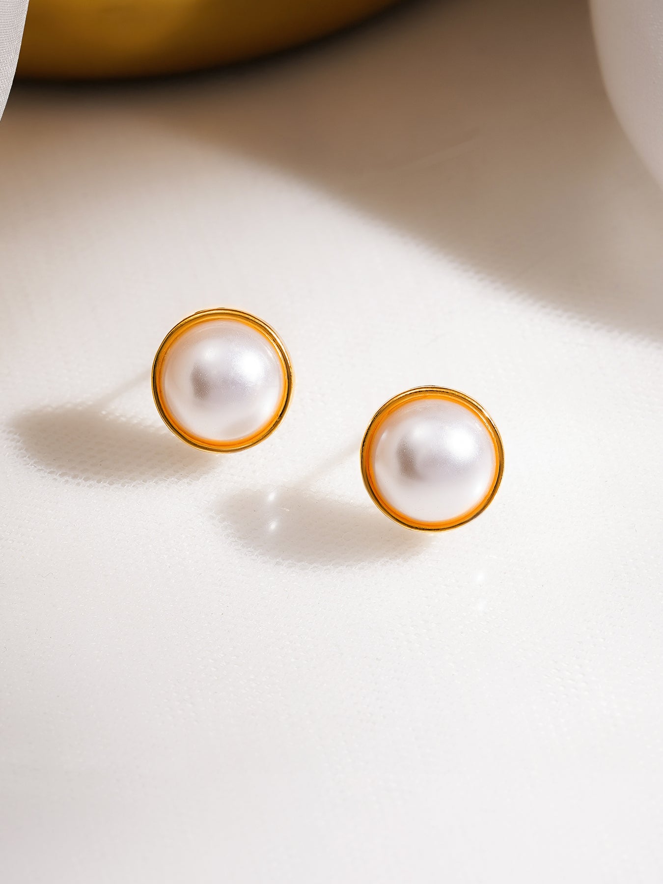 Crafted in 18K gold plated brass, these stud earrings feature a smooth white pearl centre framed in a clean round design, offering elegant comfort for daily and refined occasions.