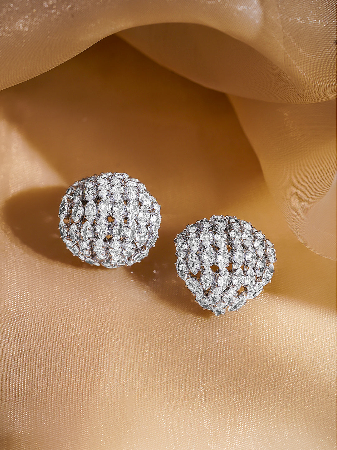 Rhodium Plated brass dome stud earrings embellished with clear Cubic Zirconia stones, offering radiant sparkle perfect for daily wear, party looks, festive styling and special occasions.