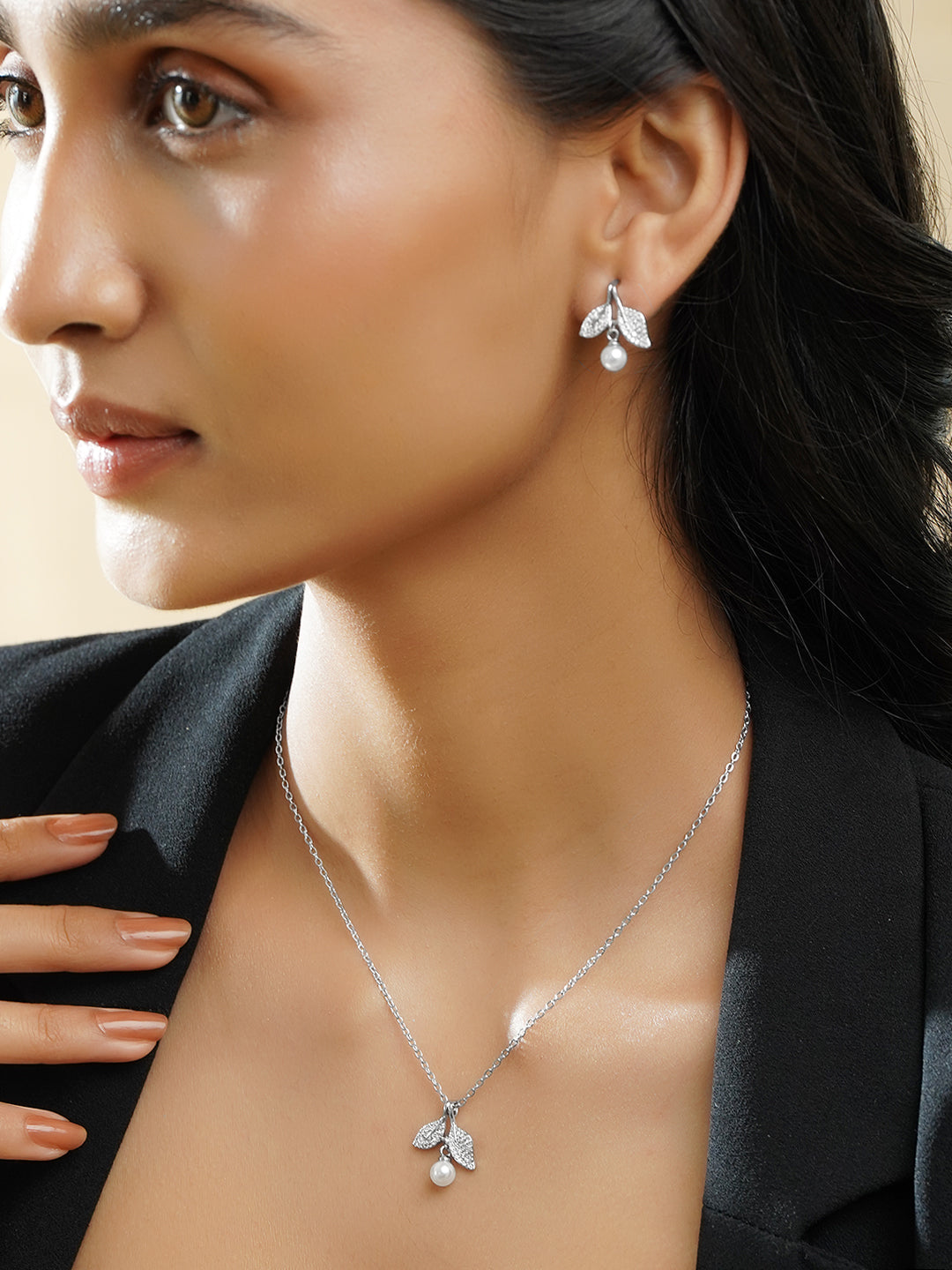 A chic rhodium plated pendant set featuring sparkling crystals and a classic pearl drop—perfect for office looks, daily wear, parties, and special occasions.