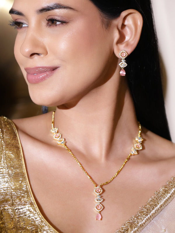 This 18K gold-plated necklace set features soft pastel pink stones paired with sparkling Cubic Zirconia accents, creating a graceful and feminine look perfect for festive and elegant celebrations.