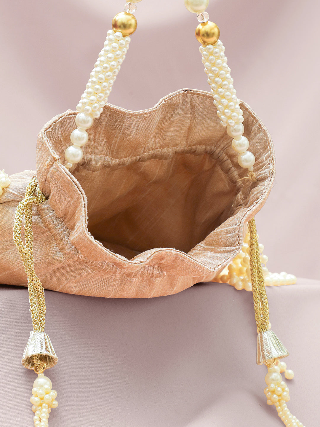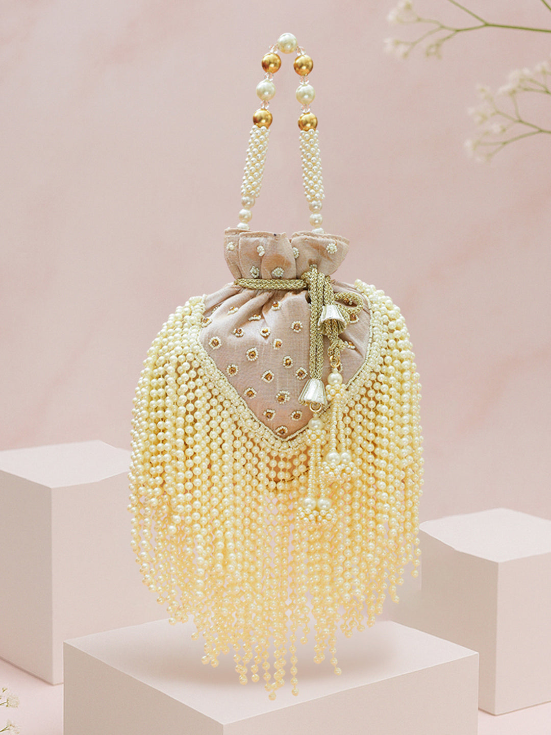 This Rubans blush beige fabric potli bag features pearl-cream fringes and a hand-embellished beaded handle — a perfect blend of timeless grace and festive luxury.