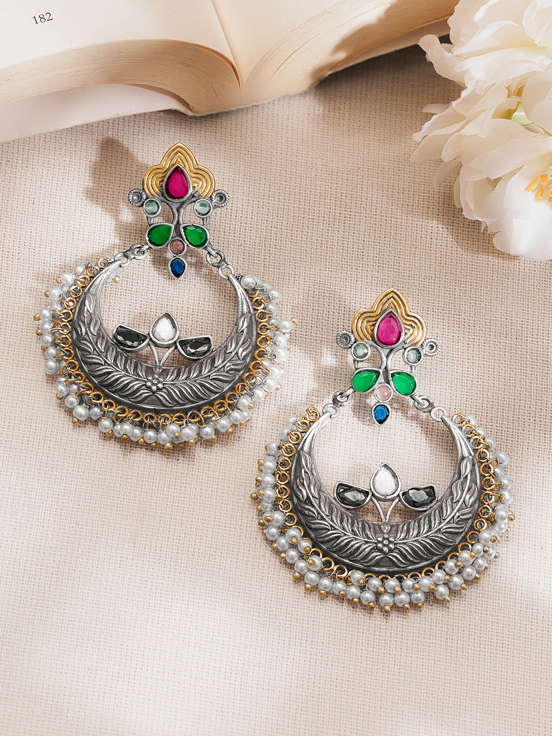 Crafted in oxidised silver-tone brass, these Rubans chandbali statement earrings feature floral artistic detailing with multicolor accents and pearl hangings, making them perfect festive jewellery and trendy fashion jewellery for women and gifting.