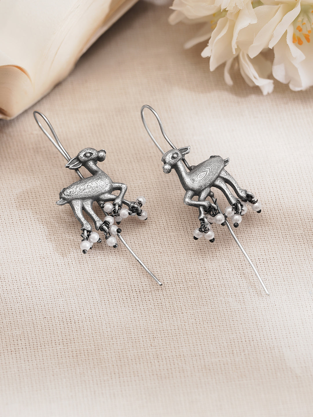 Crafted in oxidised brass this deer motif drop earring brings festive elegance with graceful pearl movement making every celebration feel special and expressive