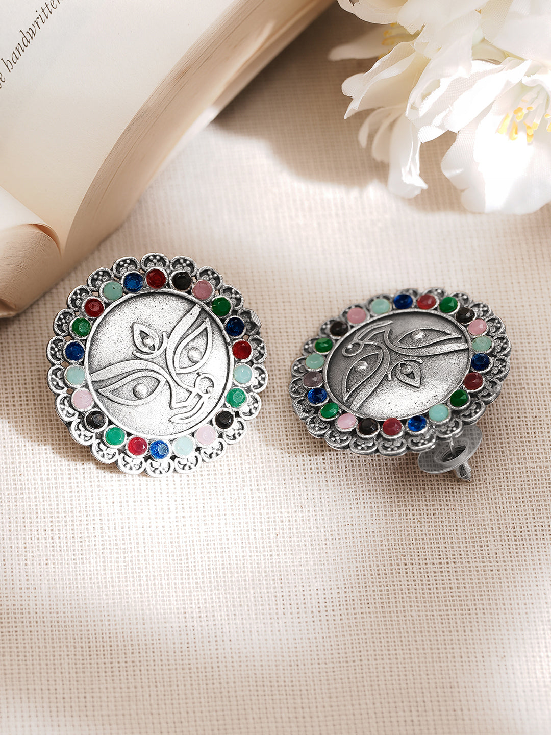 Celebrate heritage with these oxidised Durga face studs featuring vibrant multicolour accents, crafted to elevate festive looks with strength elegance and timeless cultural charm.
