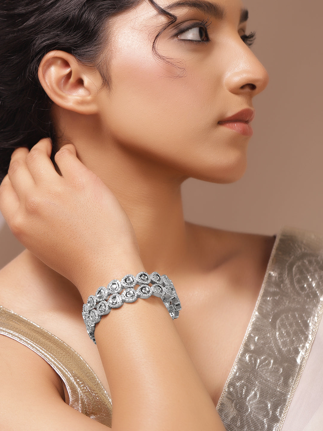 Crafted in rhodium plated Brass this elegant set of two bangles features silver tone finish with white Cubic Zirconia teardrop motifs and halo detailing offering refined shine for wedding and festive occasions