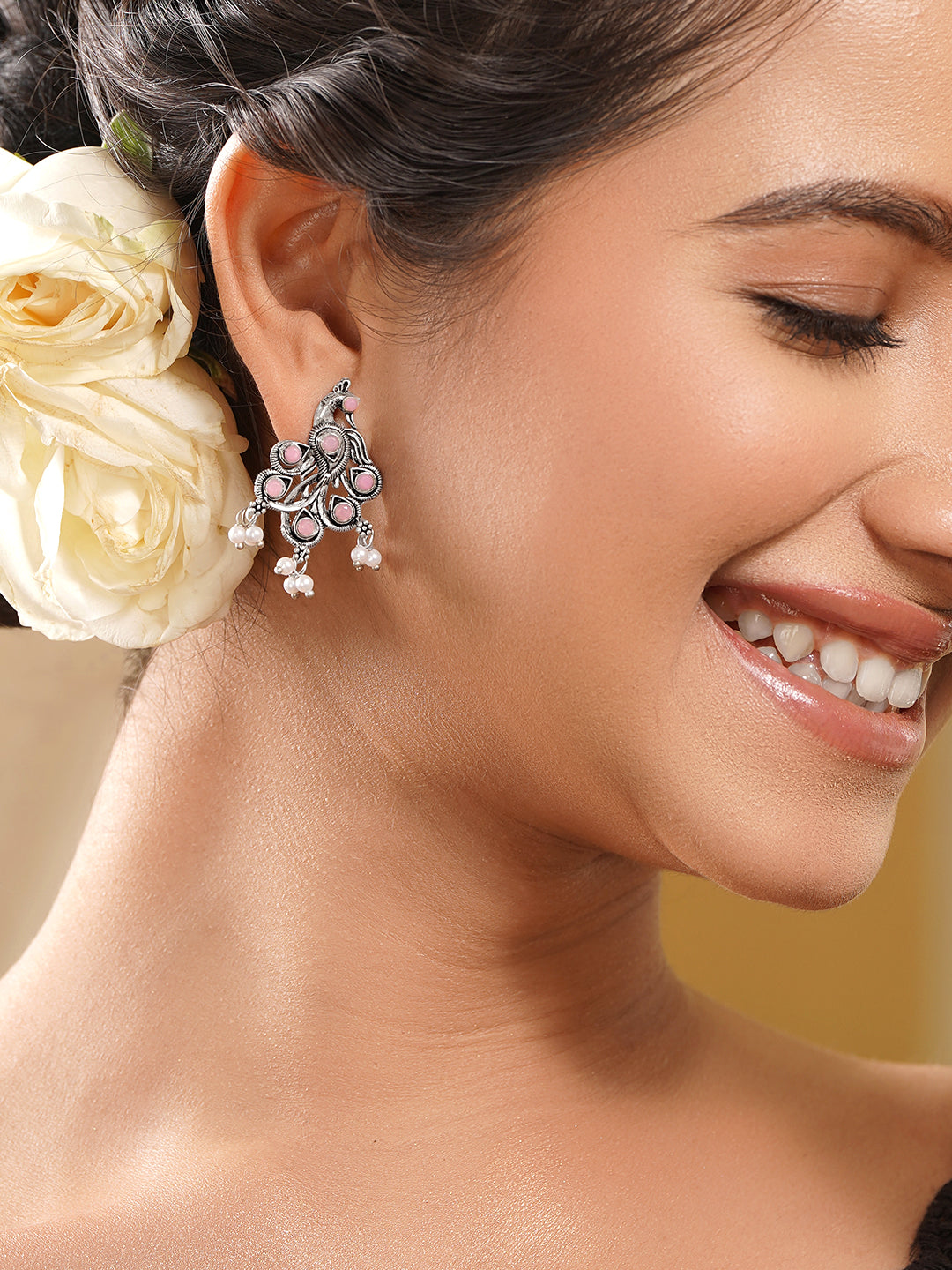 Oxidised Pastel Pink Peacock Stud Earrings