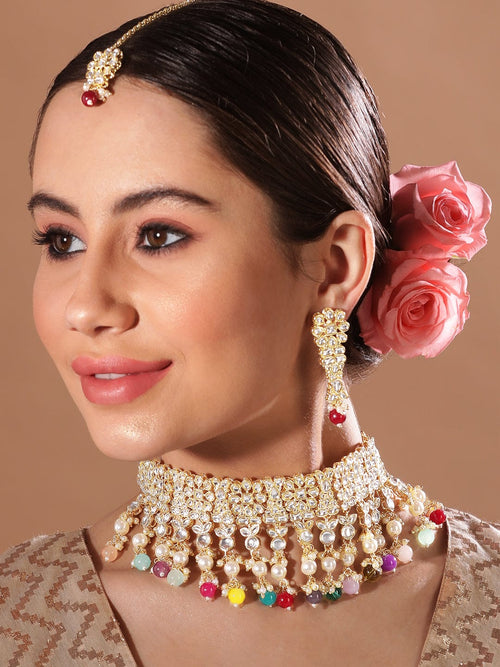 Rubans 24K Gold Plated Kundan Stone Studded Multicolour Pearl & Beads Necklace Set
